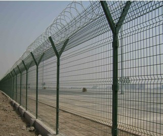 機場圍界俗稱鋼筋網圍界又稱作“Y型安全防御護網”,是由Y型支架立柱,加強型焊接片網,安全防盜連接件和熱鍍鋅刀片刺籠組成,強度和安全防御性級別很高。近年來,被廣泛應用在機場,看守所、監獄等高標準防護安全場所。